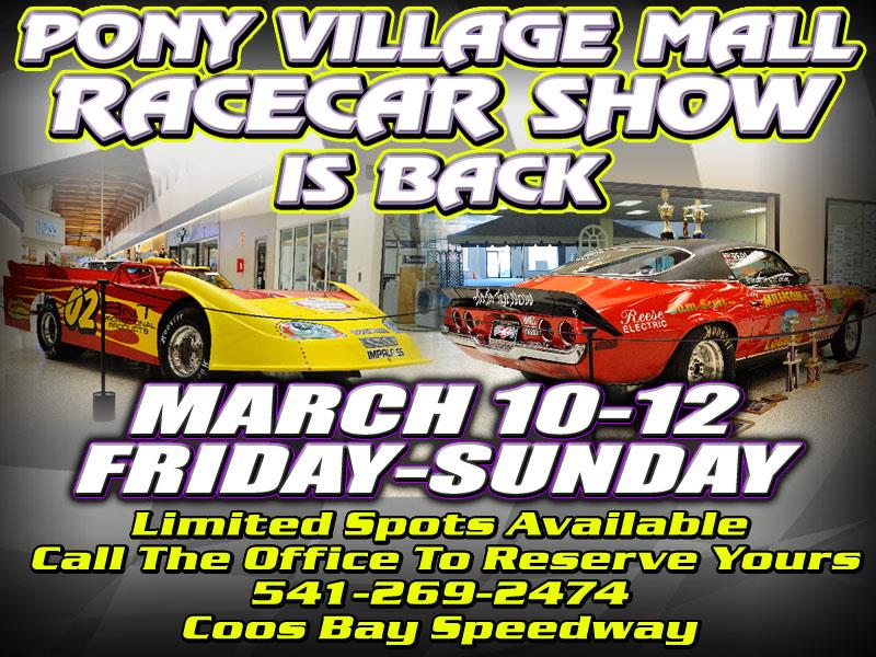The Pony Village Mall Car Display is back! Coming up March 10-12. This will be open to all Coos Bay Speedway competitors. If you have an interest in showing your car inside the mall please call the office to reserve your spot 541-269-2474. Space is limited. Cars will go in the mall Thursday Night the 9th and will be pulled out Sunday evening the 12th after the mall closes. We look forward to showing off your rides just before the season arrives!