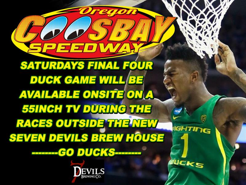 The Oregon Duck's are in the Final Four this Saturday Night we wanted to make sure that the game was available to those who are torn as to what they want to do Saturday. Do I stay home and watch the game or do I go to the races and miss it? The game will be available on a 55-inch tv in the main grandstand midway. With our top load grandstands, you can keep up to date with the game and cheer on your favorite driver.