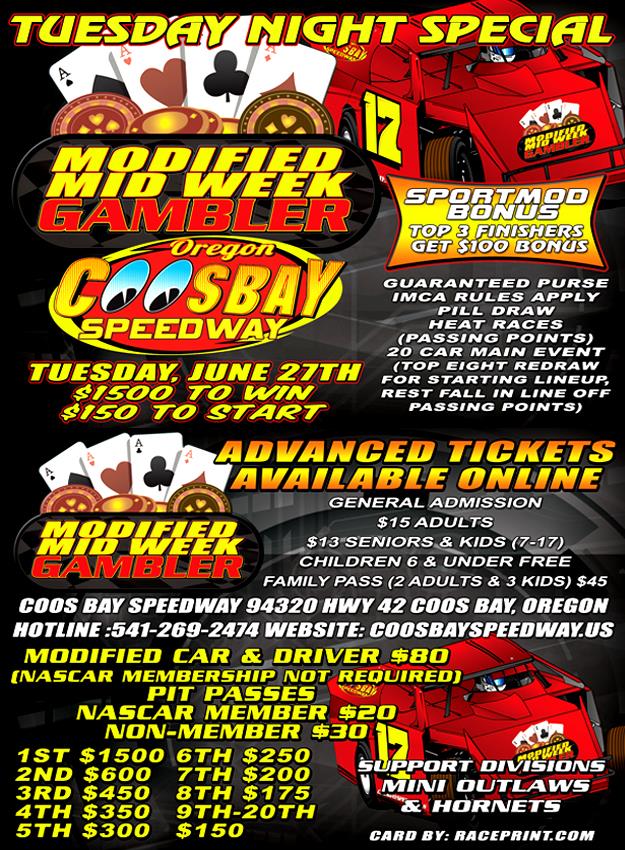 It's a crazy week of Modified racing in the state of Oregon and Coos Bay Speedway is your go-to place for action Tuesday Night June 27th. Tickets are available online www.coosbayspeedway.us or call the hotline 541-269-2474 for more information.