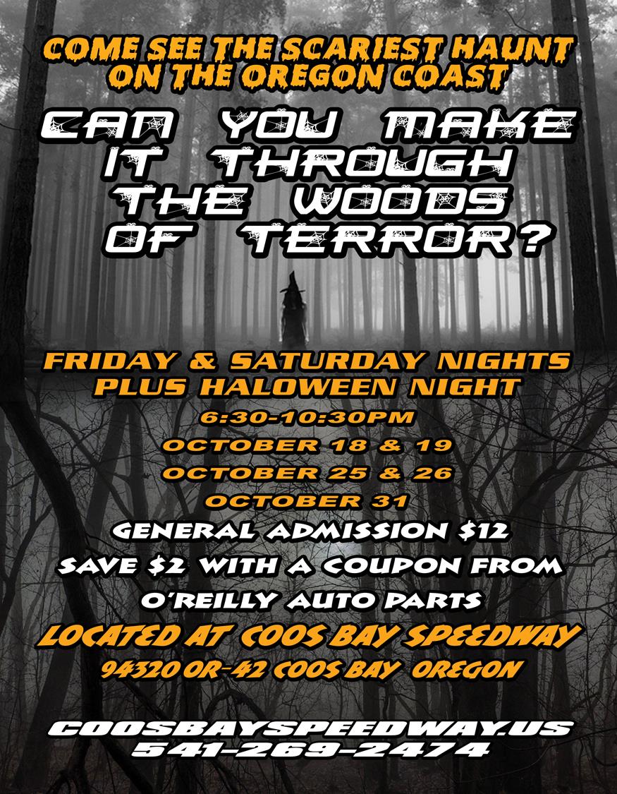 Can you make it through the Woods of Terror? Head on out to the Coos Bay Speedway for a fun and freaky time not for the faint at heart. Witness all kinds of scares from great props to live actors as you work your way through the wooded trail of terror.