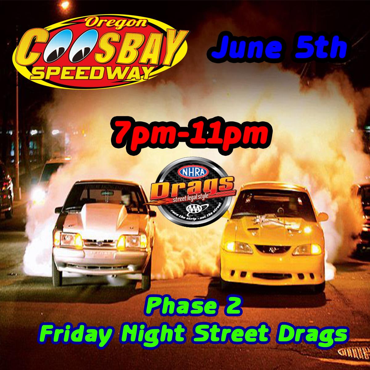 Welcome to phase two! A last-minute FRIDAY NIGHT DRAGS is on the schedule for tomorrow June 5th (Friday Night)! That's right we are swinging open the gates to the street racers tomorrow night. Call you friends and let them know not only are we racing in the Mud on Saturday but we get to play on the Strip at Coos Bay Speedway tomorrow night!