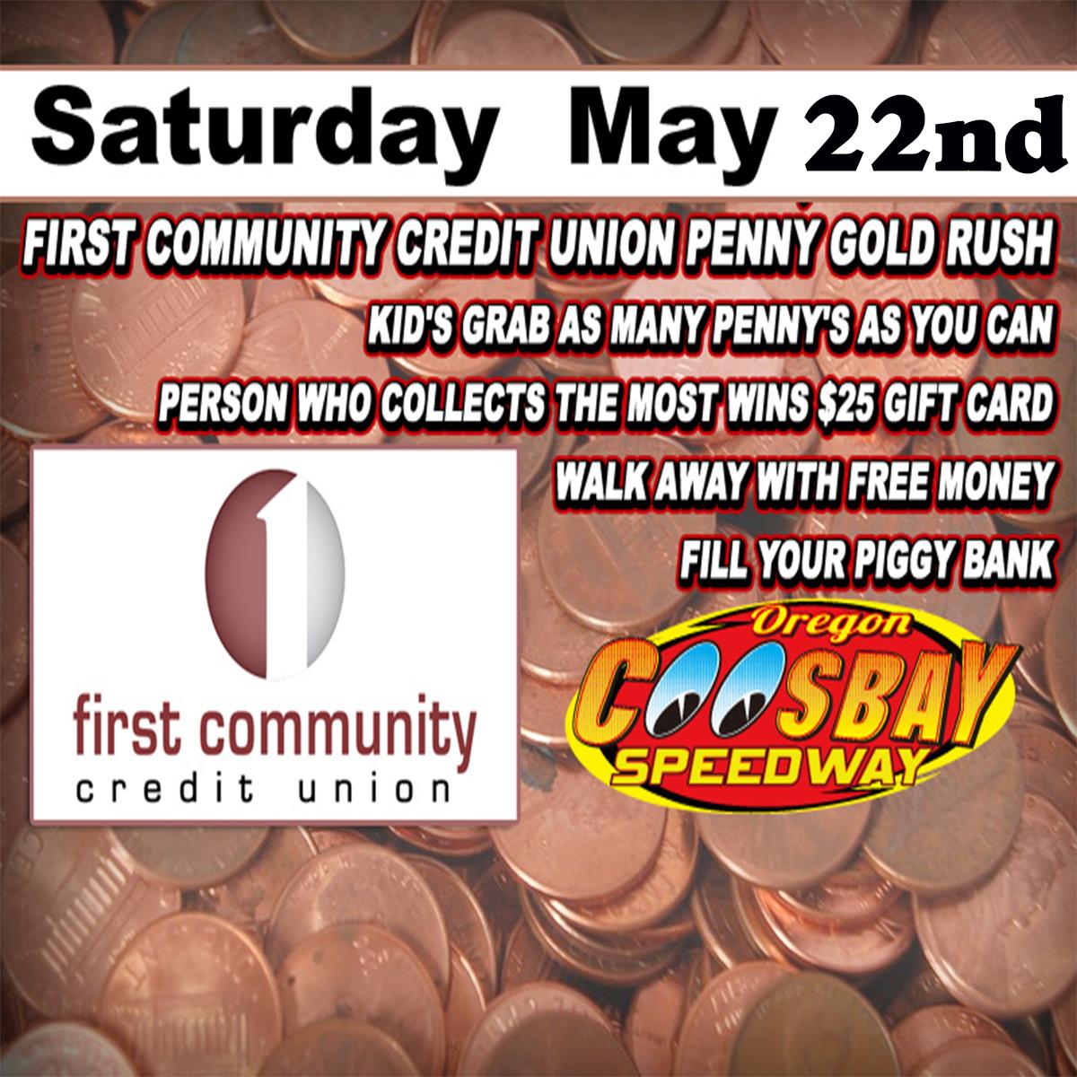 Kid's it's time to scoop up some money from First Community Credit Union with the Penny Gold Rush. All kids 12 and under can go down and try and get as many coins as possible in the 3-minute time limit to hopefully win the $25 gift certificate to the person with the most coins, plus you get to keep all coins for your piggy bank at home! It's a fun time for all kids this Saturday Night May 22 at the Coos Bay Speedway.