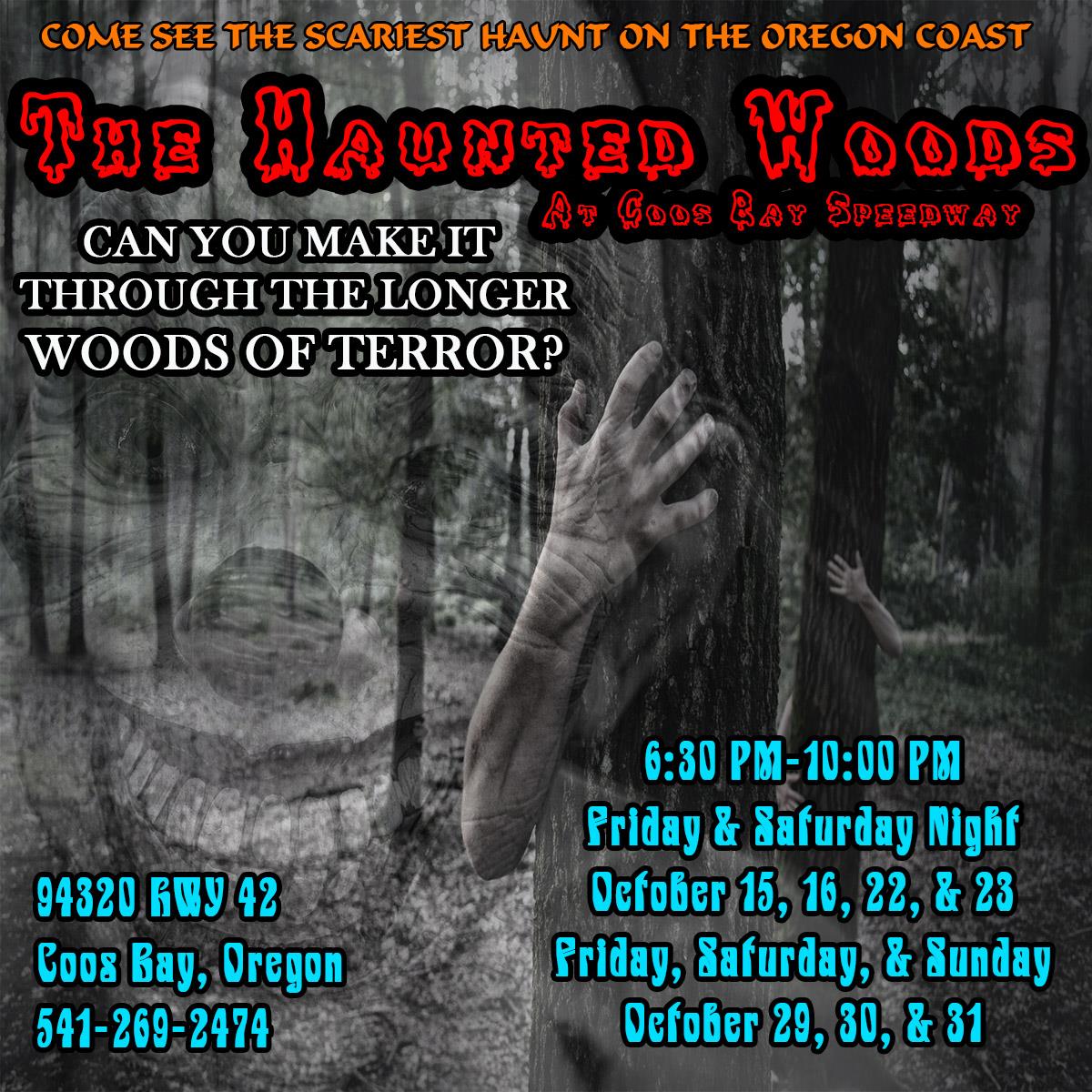 Can you make it through the extended Woods of Terror or are you going to bail out at the old ending? Head on out to the Coos Bay Speedway for a fun and freaky time not for the faint at heart. Witness all kinds of scares from great props to live actors as you work your way through the wooded trail of terror.