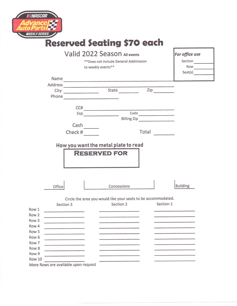 Do you like to sit in the same seat for every event? Are you afraid that someone might be sitting there if you don't show up early enough? If you answered yes to either of these questions then buying a reserved seat may be for you. Reserved Seating is now available for the 2022 season. We are now offering patrons the ability to reserve their seats for the season. For $70 a plaque will be made and attached to the seat of your choice. Now there is no need to worry about someone else getting to your seat before you do on race day!