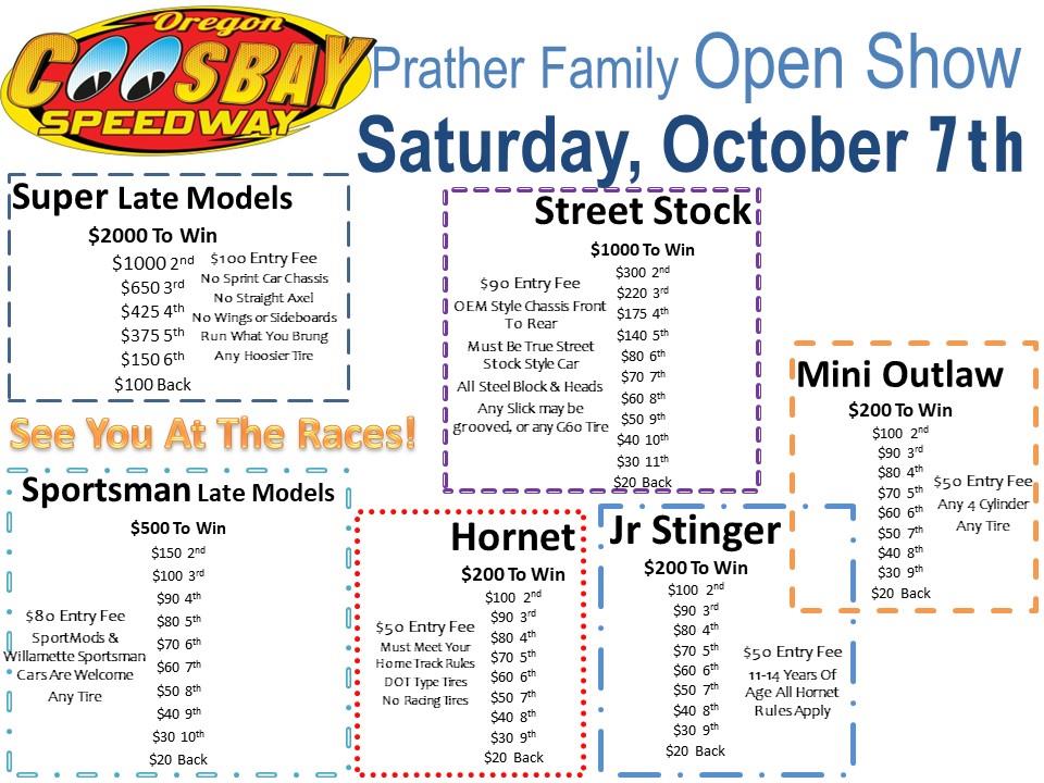 Now that we are into the month of October it's time for the annual Open Show here at the Coos Bay Speedway. This is a fun one that has little rules and lots of money up for grabs for all divisions running.