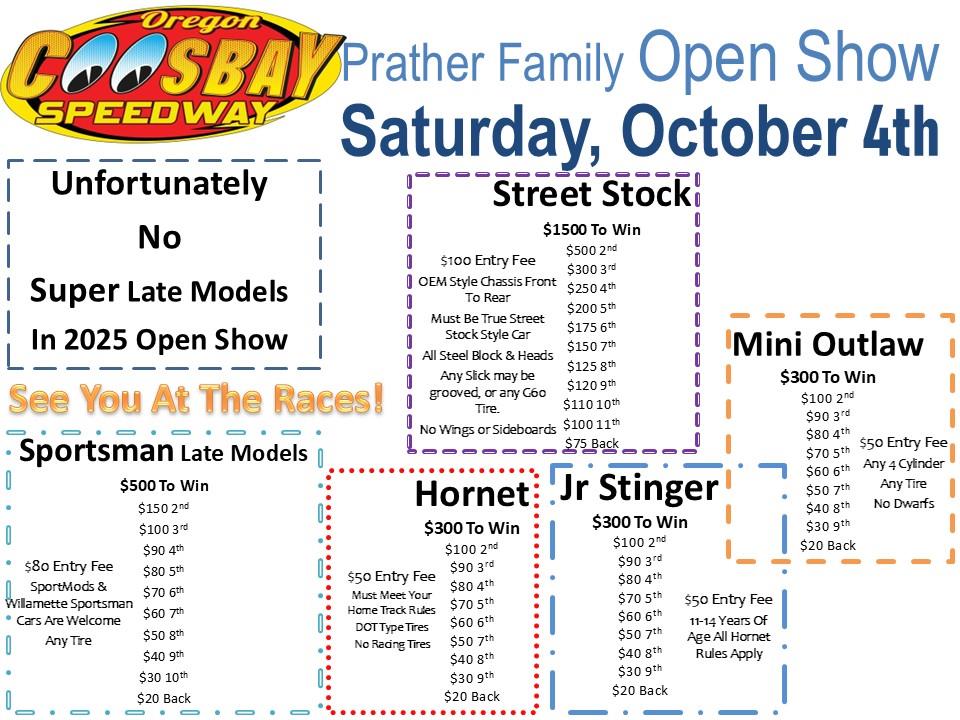 Prather Family Open Show – October 4 at Coos Bay Speedway